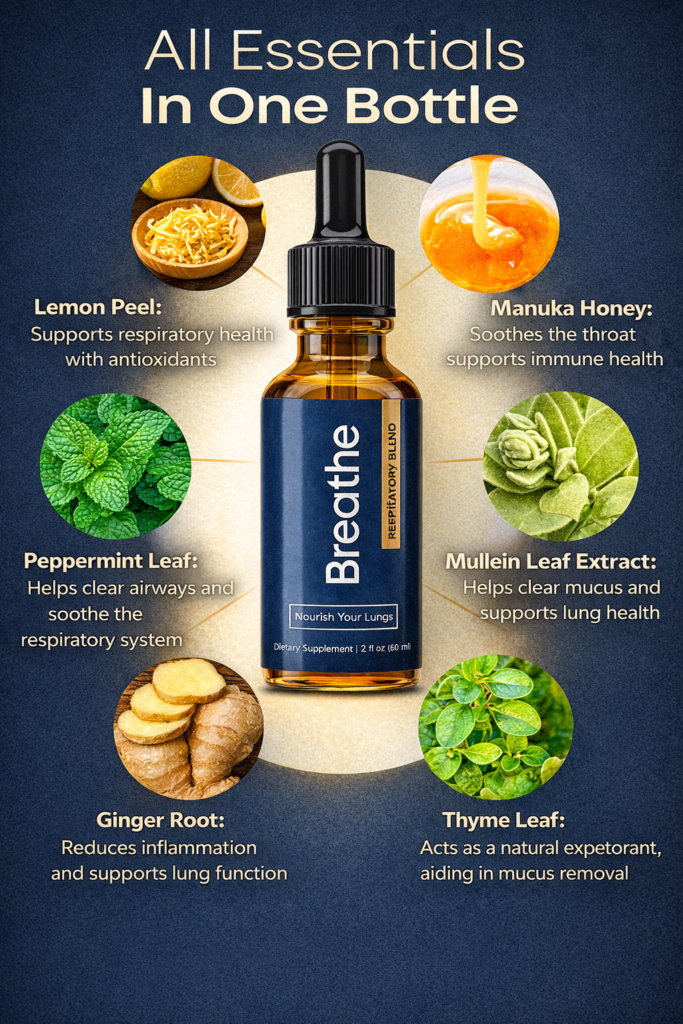 Breathe is a thoughtfully crafted health supplement designed to boost lung function and enhance overall respiratory wellness. It specifically targets common challenges such as chronic mucus buildup, blocked airways, and the discomfort of wheezing or chest tightness.